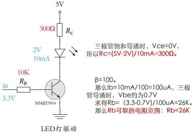 单片机输出3.3V,(3.3 - 0.7 ) /1k*1k=2.6V,基极电压为 2.6 V,而LED那里,跟地之间只有三极管CE之间的压降,约0.2V,P > N正偏,满足条件。