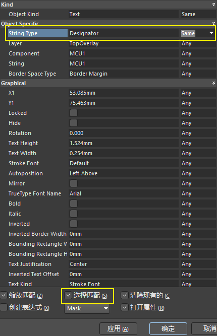 距离测量点到点距离测量:【CTRL+M】 或者 【R+M】边缘间距测量:【R】【P】【Shift+C】清除测量结果批量修改丝印大小(1)选中一个位号,右键【查找相似对象】(2)设置匹配条件(3)设置丝印宽高(4)完成后清除匹配批量过孔盖油尺寸标注