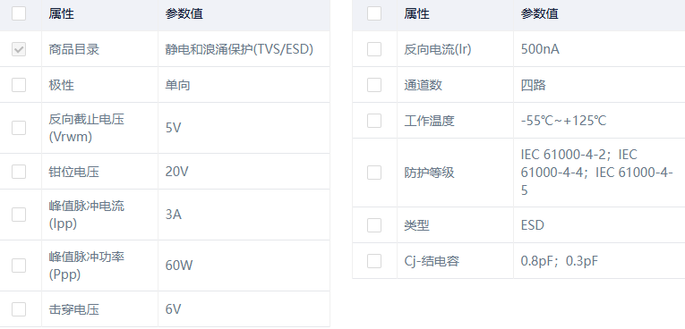 (1)看工作电压,就是这个反向截止电压 (Vrwm),是5V,说明它0~5V 不工作,符合上面电路的 3.3V,不会影响原来的电路工作。