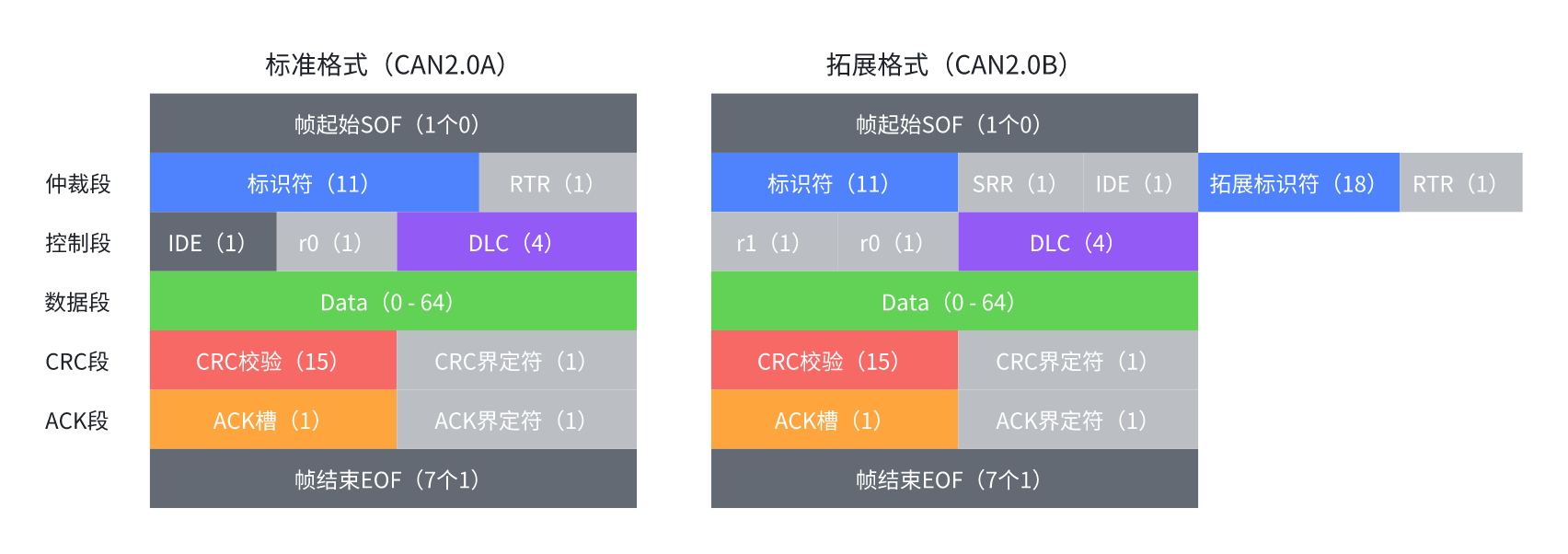 多了 SRR 位。SRR 只用于仲裁,无其他功能。值为 1,因此标准格式的优先级大于拓展格式。
