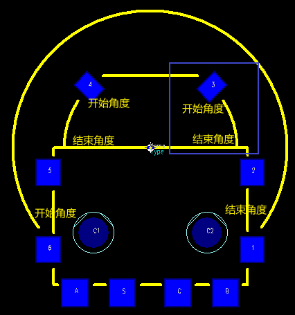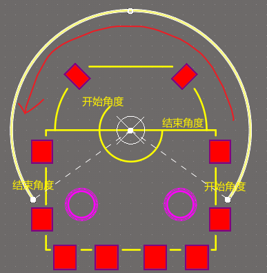 AD中的弧形,按逆时针转动,第一个点为开始角度,第二个点为结束角度。