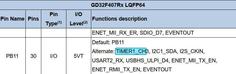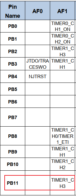 (2)根据 PB11 引脚,在表中找到对应外设(TIMER1)的复用号 AF?
